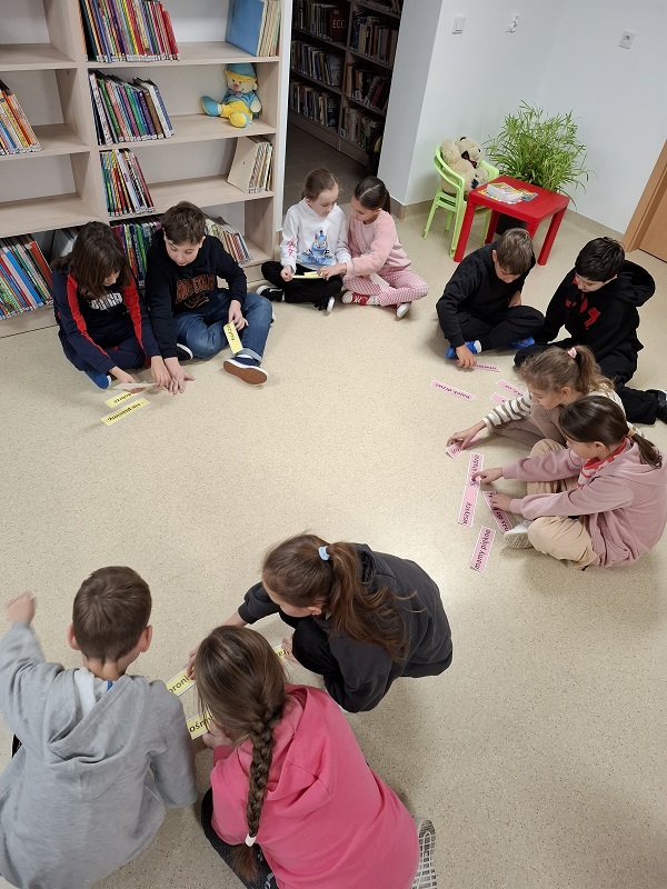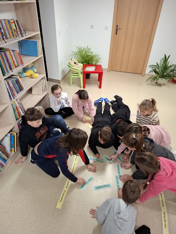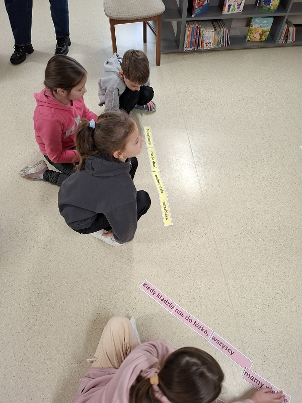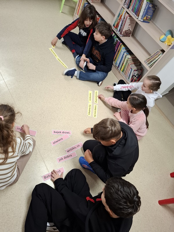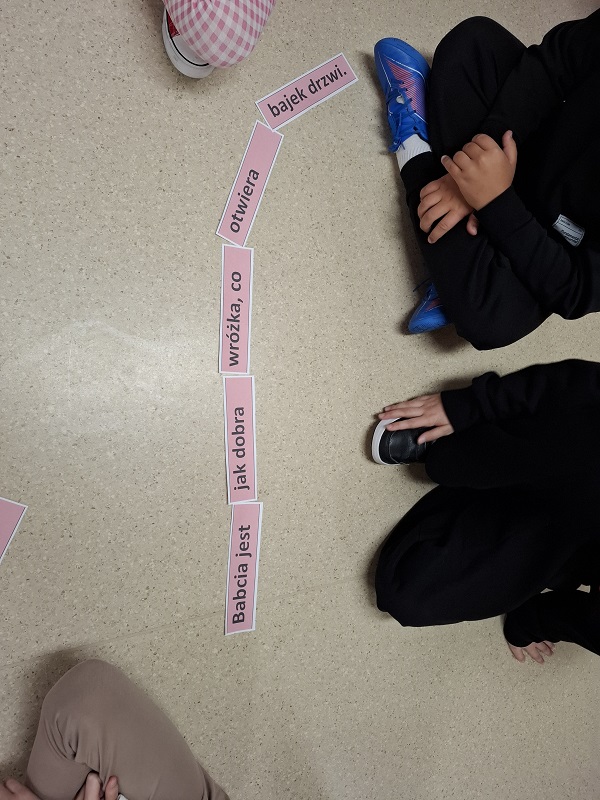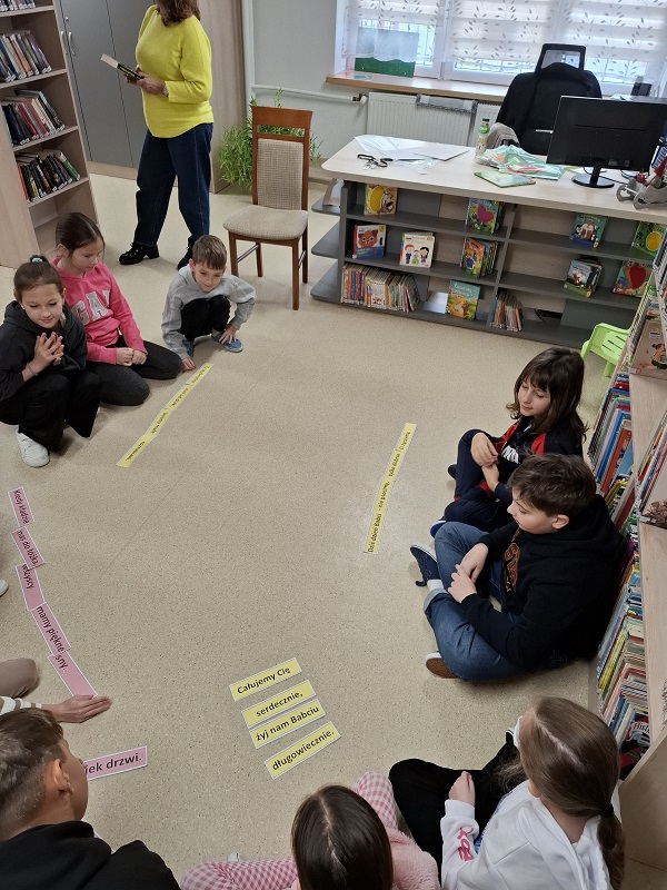 Podczas zajęć dzieci pracowały z rozsypankami zdaniowymi. Ich zadaniem było ułożenie poprawnych zdań opisujących troskę i miłość dziadków, m.in.: „Babcia jest jak dobra wróżka, co otwiera bajek drzwi”. Ćwiczenie to rozwijało umiejętność logicznego myślenia, współpracy oraz pozwalało wyrazić ciepłe uczucia wobec babć i dziadków.