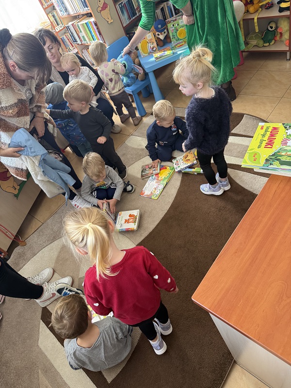 Dzieci z zainteresowaniem przeglądały kolorowe książeczki, słuchały czytanych bajeczek oraz poznawały nowe miejsce, jakim była biblioteka. Wizyta przebiegła w radosnej atmosferze i była dla najmłodszych wspaniałą okazją do pierwszego spotkania z magicznym światem książek.