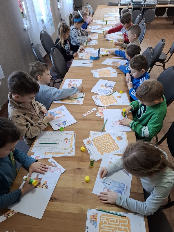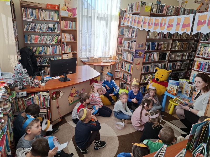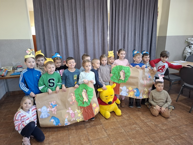 21 stycznia klasa 0 uczestniczyła w zajęciach czytelniczo - warsztatowych w Filii Biblioteki w Florynce, zorganizowanych z okazji Dnia Kubusia Puchatka. Podczas spotkania dzieci poznały postać Kubusia Puchatka oraz jego przyjaciół ze Stumilowego Lasu. Wysłuchały krótkiego opowiadania pt. „Wiej wietrze, wiej!”, a następnie brały udział w różnorodnych aktywnościach: dopasowywały cienie do postaci, rysowały po śladach, szukały miodku w labiryncie oraz uczestniczyły w zabawach ruchowych.