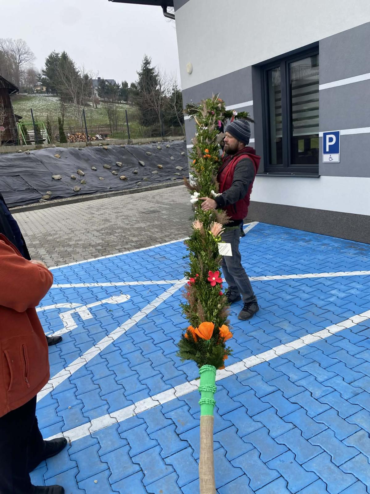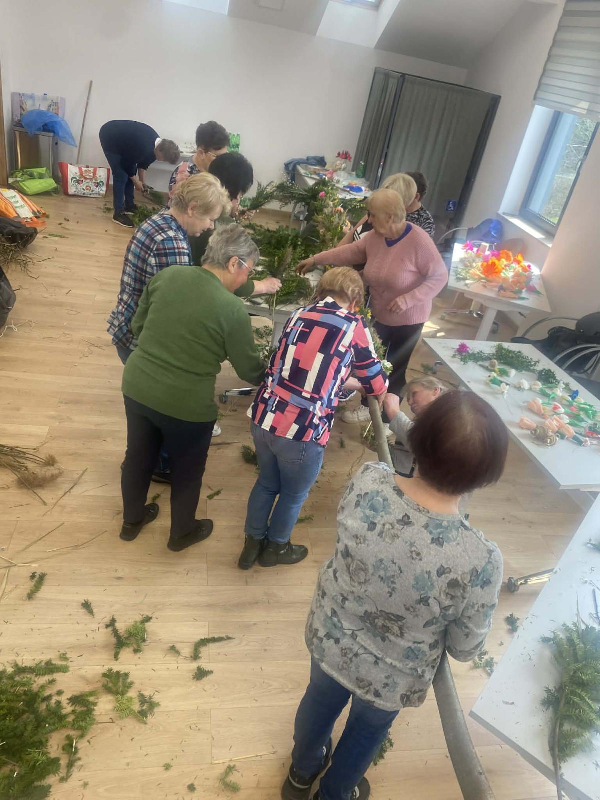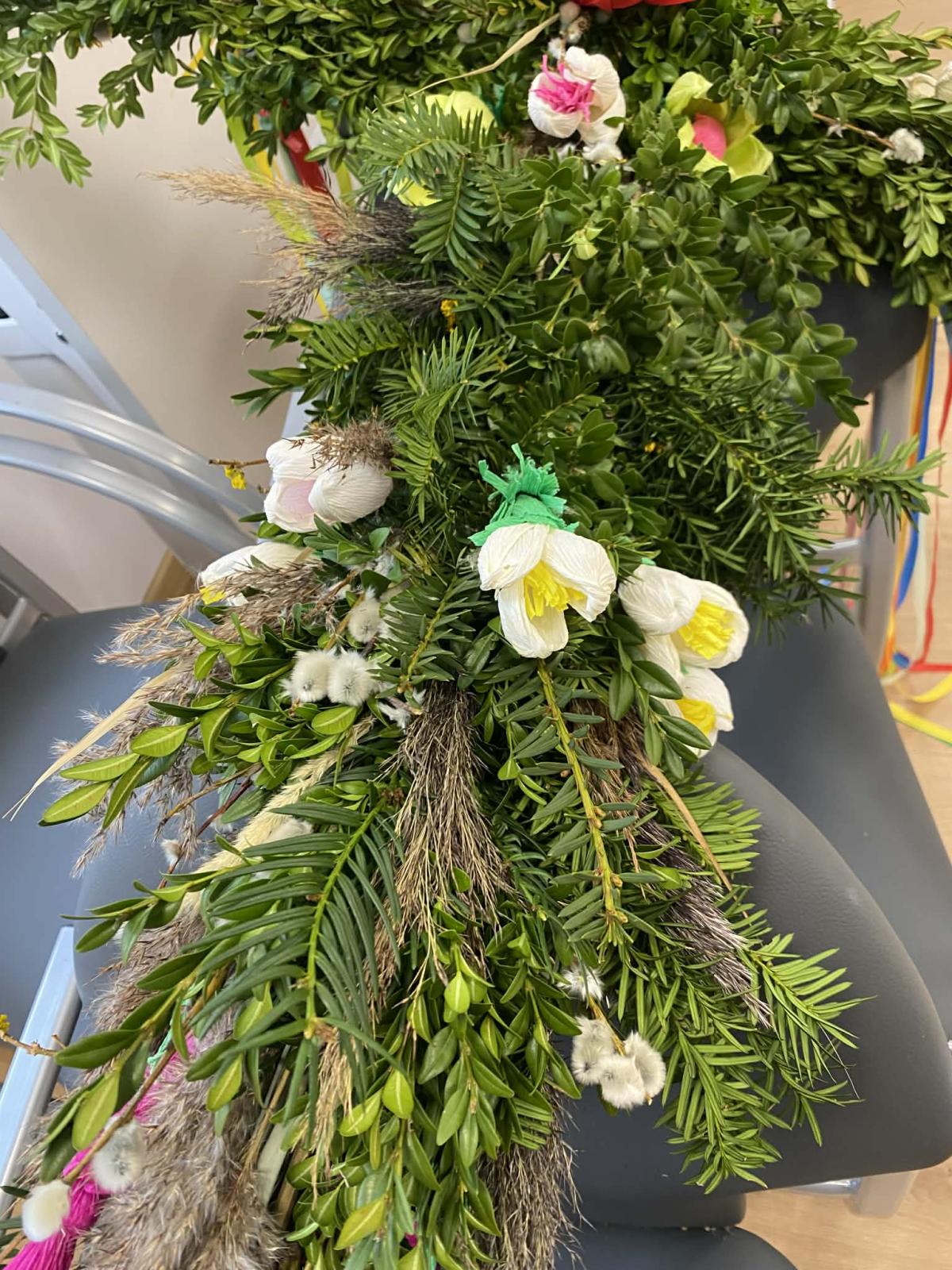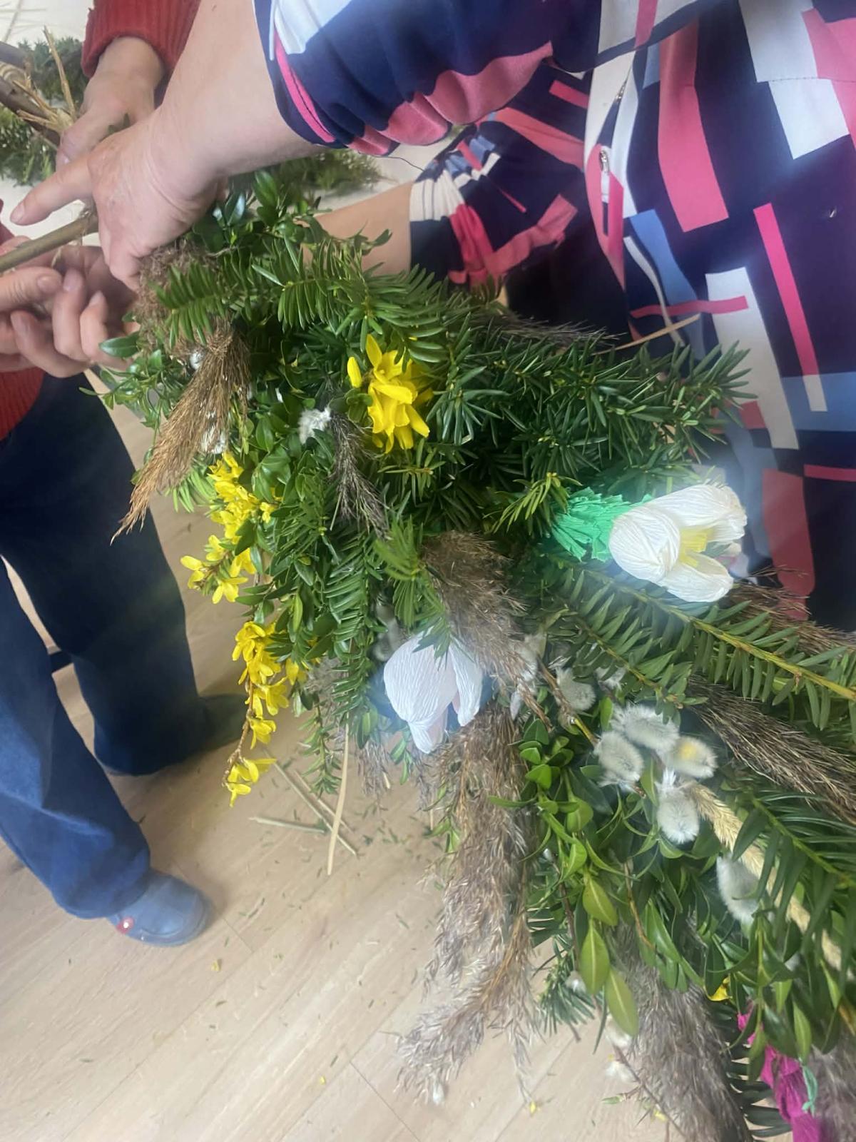 Po wielu konsultacjach oraz licznych godzinach pracy — przy tworzeniu kwiatów, zbieraniu bazi i zieleniny, a wreszcie przy samym pleceniu — udało się stworzyć wyjątkową, bardzo wysoką, tradycyjną palmę na Niedzielę Palmową. Seniorzy wykazali się ogromnym zaangażowaniem, dbając o to, by tradycji stało się zadość.