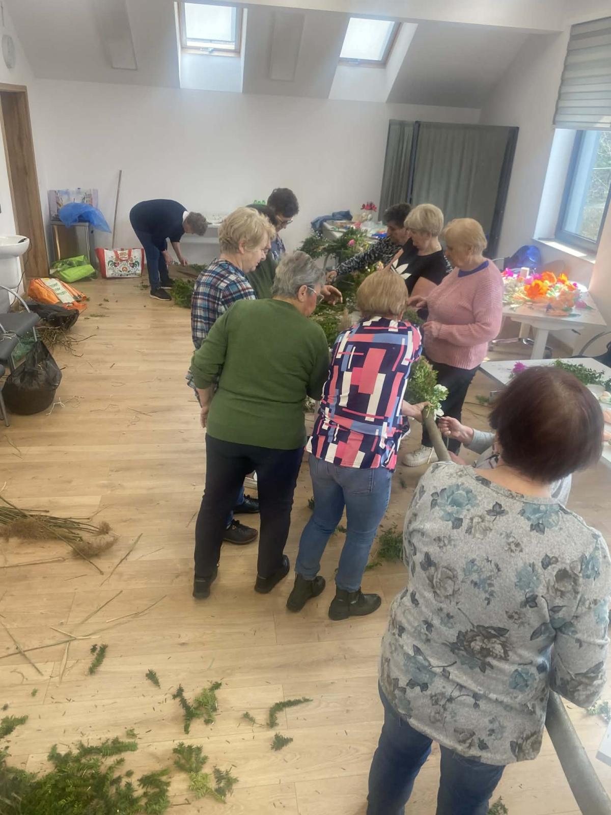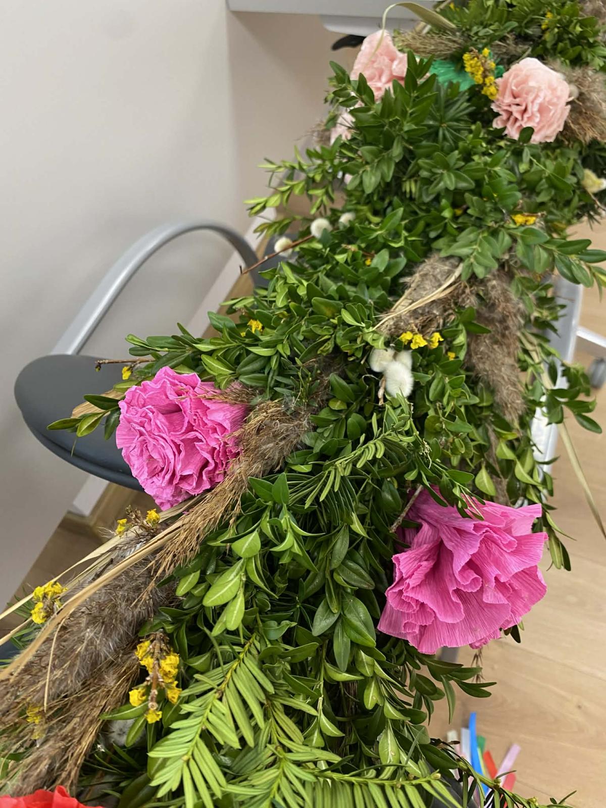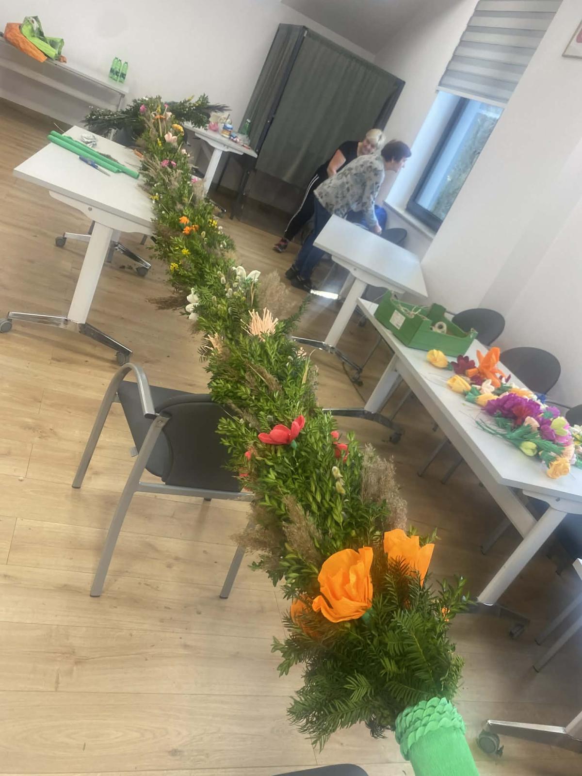 Po wielu konsultacjach oraz licznych godzinach pracy — przy tworzeniu kwiatów, zbieraniu bazi i zieleniny, a wreszcie przy samym pleceniu — udało się stworzyć wyjątkową, bardzo wysoką, tradycyjną palmę na Niedzielę Palmową. Seniorzy wykazali się ogromnym zaangażowaniem, dbając o to, by tradycji stało się zadość.