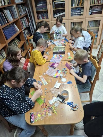 Zajęcia miały na celu nie tylko rozwijanie zdolności manualnych i kreatywności, ale także integrację dzieci i wspólne, radosne spędzenie czasu. Pod czujnym okiem bibliotekarki dzieci z zapałem nawlekały koraliki, łączyły je z gumkami i tworzyły własne, niepowtarzalne kompozycje. W ruch poszły także koraliki literkowe, które pozwoliły na personalizację biżuterii – wielu uczestników z dumą prezentowało bransoletki z własnym imieniem.