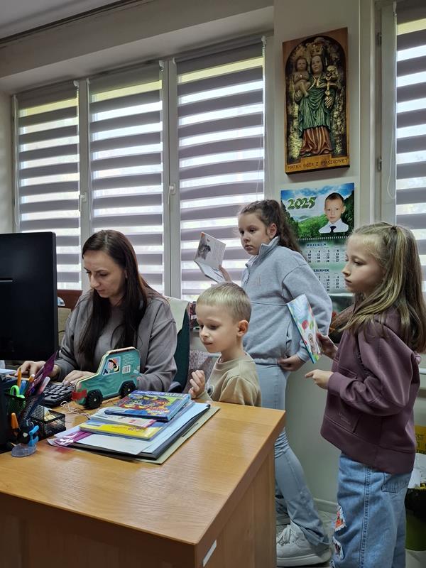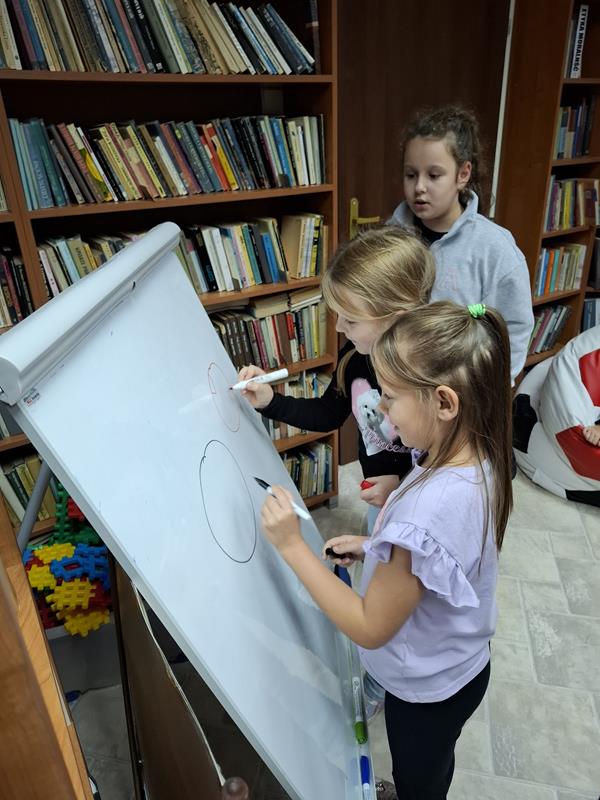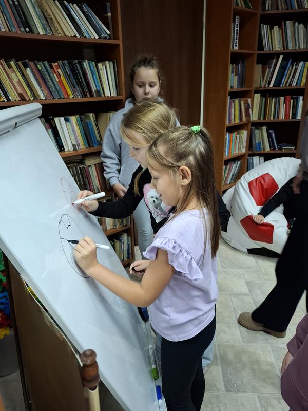 Po twórczej pracy przyszedł czas na zabawę w kalambury. Ta część zajęć wywołała najwięcej śmiechu. Dzieci pokazywały oraz rysowały hasła związane z bajkami, zwierzętami czy ulubionymi postaciami z książek, a reszta grupy próbowała je odgadnąć. Zabawa świetnie integrowała uczestników, uczyła współpracy i pobudzała wyobraźnię.Na zakończenie spotkania nie mogło zabraknąć czegoś, co jest sercem biblioteki - wypożyczanie książek. Po zajęciach dzieci chętnie sięgały po książki, wybierając lektury do domu. Wśród najczęściej wybieranych pozycji znalazły się bajki, książki przygodowe oraz kolorowe opowiadania dla młodszych czytelników.